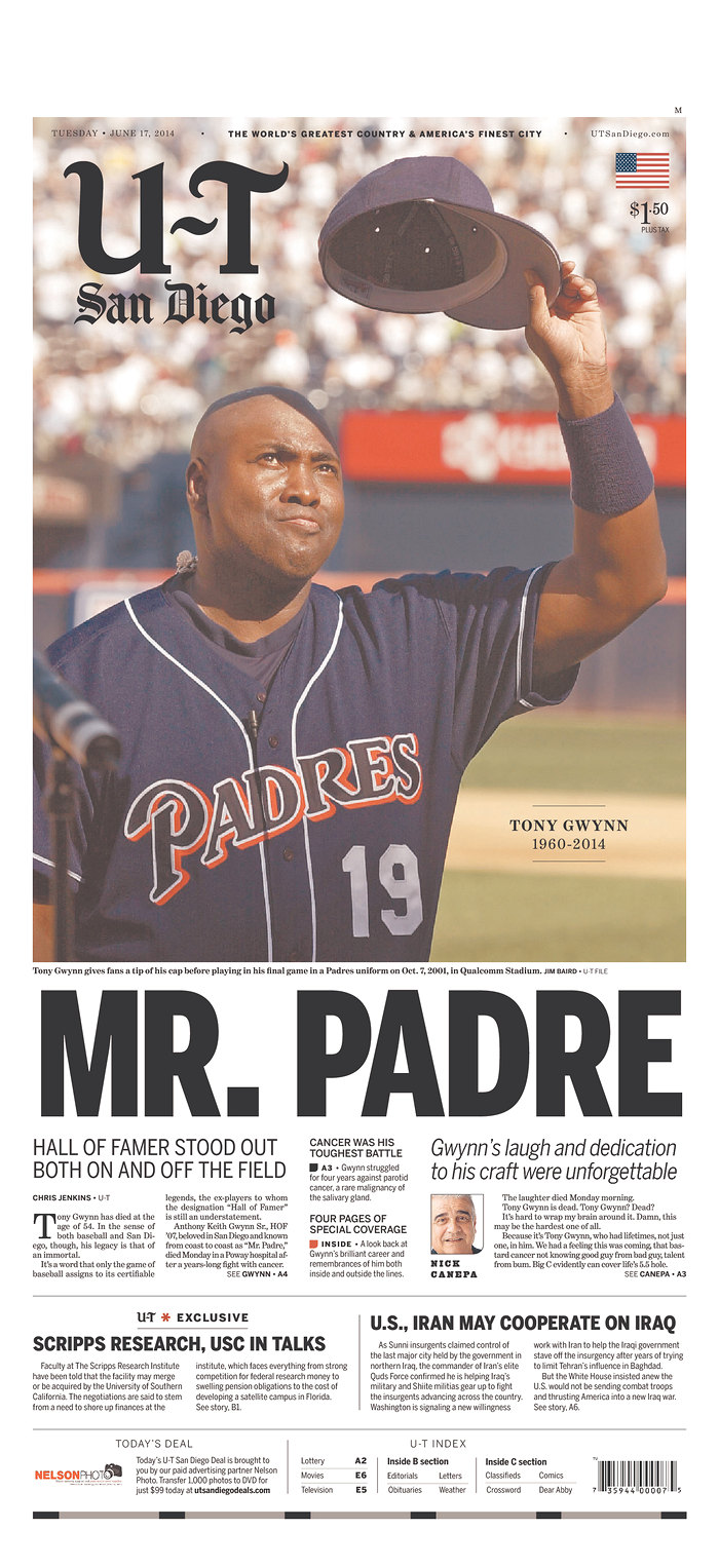 Gwynn Published June 17, 2014 at 700 × 1527 in Front pages: San Diego Union-Tribune shows how city loved Tony Gwynn; ‘Baseball reporter’s best friend’